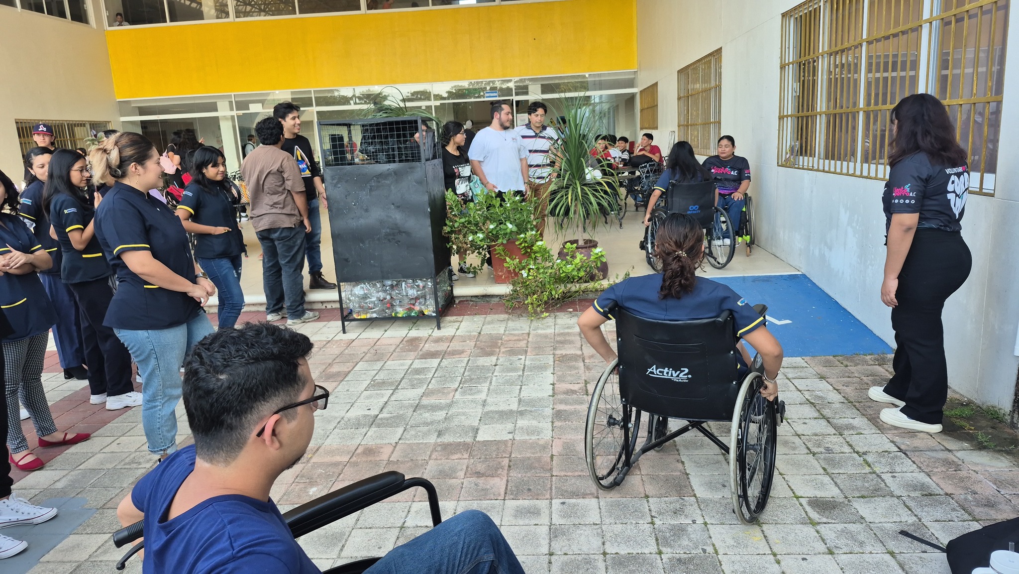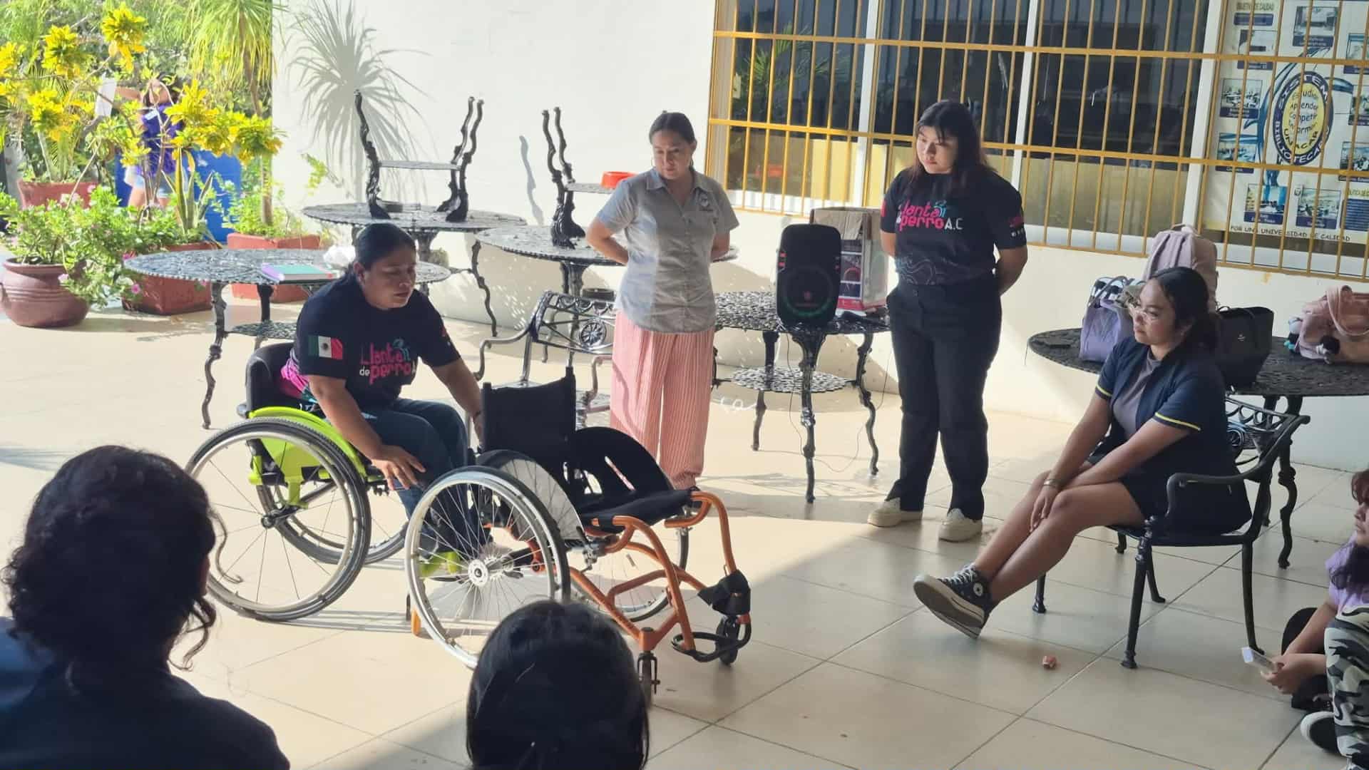 Posteriormente, junto con sus voluntarias, dieron a conocer detalles importantes sobre las sillas de ruedas, sus usos y diferencias; además los alumnos practicaron el desplazamiento subiendo y bajando rampas y banquetas, así como controlar la dirección y peso corporal al utilizarlas librando también obstáculos.